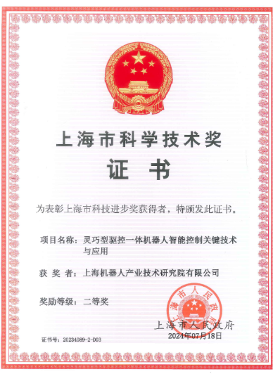 参与《灵巧型驱控一体机器人智能控制关键技术与应用》项目,获得上海市科技进步奖二等奖。